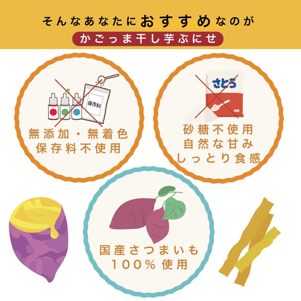 自然の甘みが詰まったかごっま干し芋 ぶにせ。国産の厳選されたさつまいもを使用しました。しっとりとした食感と、濃厚な甘さが口いっぱいに広がります。