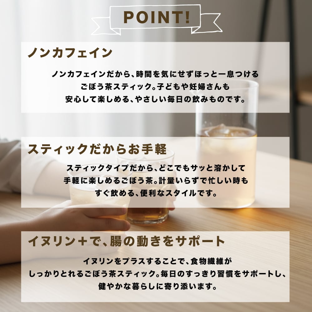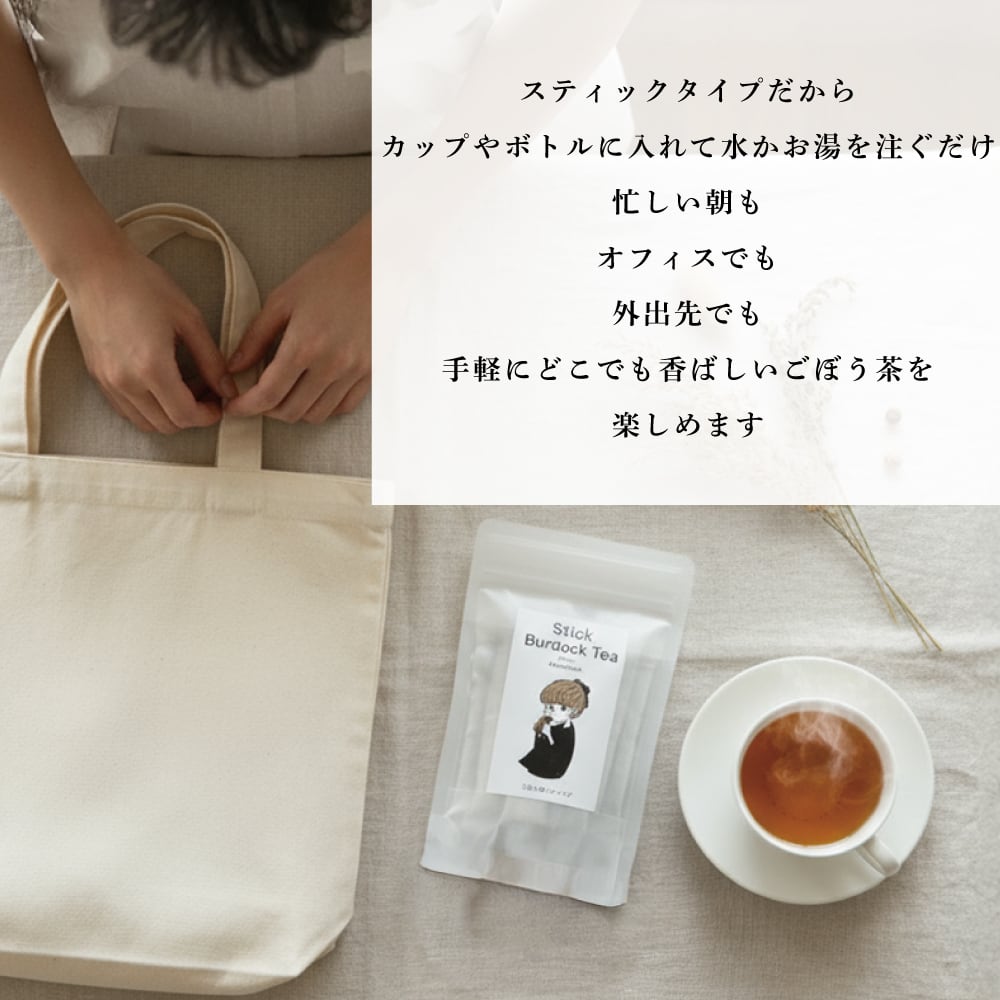 さらに、少量でもしっかりとした風味が楽しめるため、忙しい日常の中でもスムーズにごぼうの栄養を取り入れることができます。外出時や旅行時にも便利なパッケージで、どこでも手軽に美味しさをお楽しみいただけます。ぜひ、ごぼう茶スティックをお試しください!
