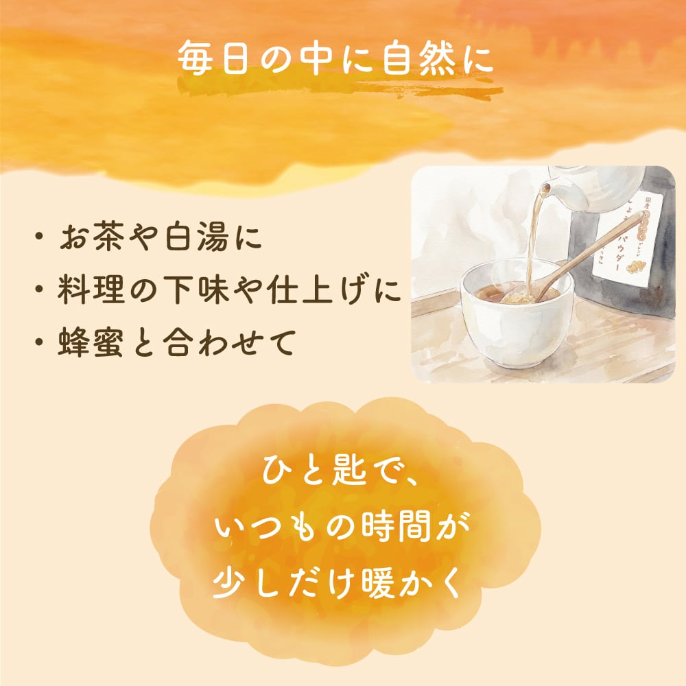 このしょうがパウダーは、ピリッとした辛味が特徴です。料理だけでなく、お菓子やドリンクのアレンジにも最適で、さまざまなシーンでお楽しみいただけます。特に寒い季節には体を温める一品として、心身ともにリフレッシュできること間違いなしです。