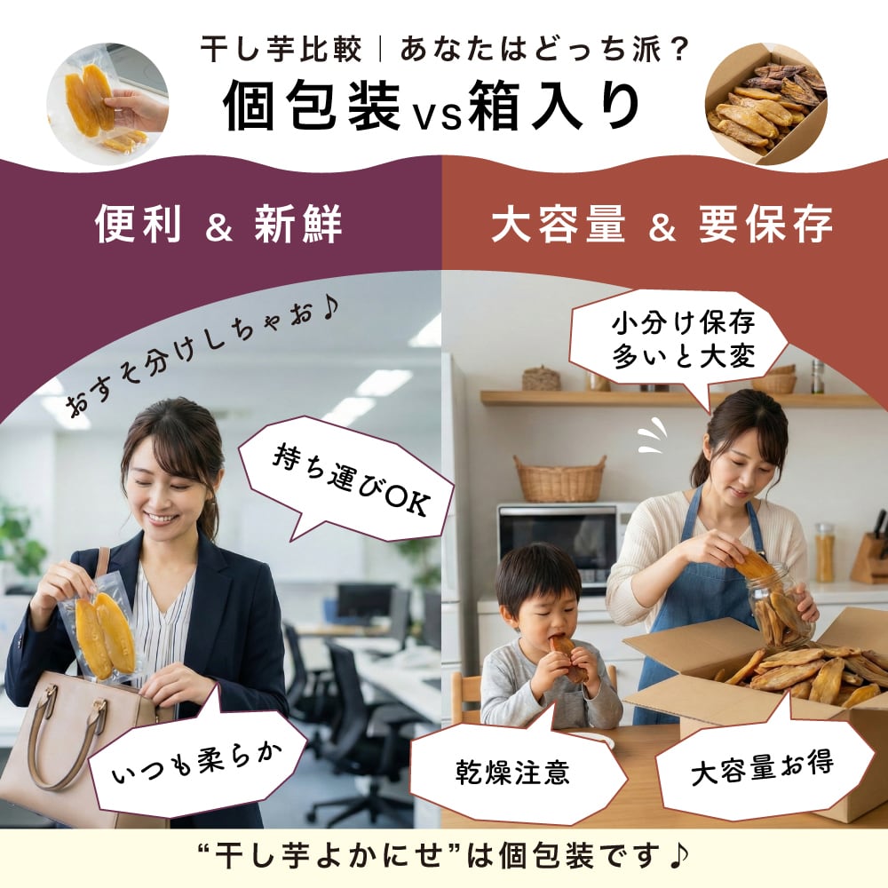 手軽に食べられる個包装2袋は、いつでもどこでも、おやつタイムやちょっとした小腹満たしに最適です。袋を開ければ、芳醇な香りが広がり、お子様から大人まで楽しめるスイーツとして、毎日の食卓に彩りを添えてくれます。ぜひ、“プレミアム干し芋よかにせ”をお試しください!