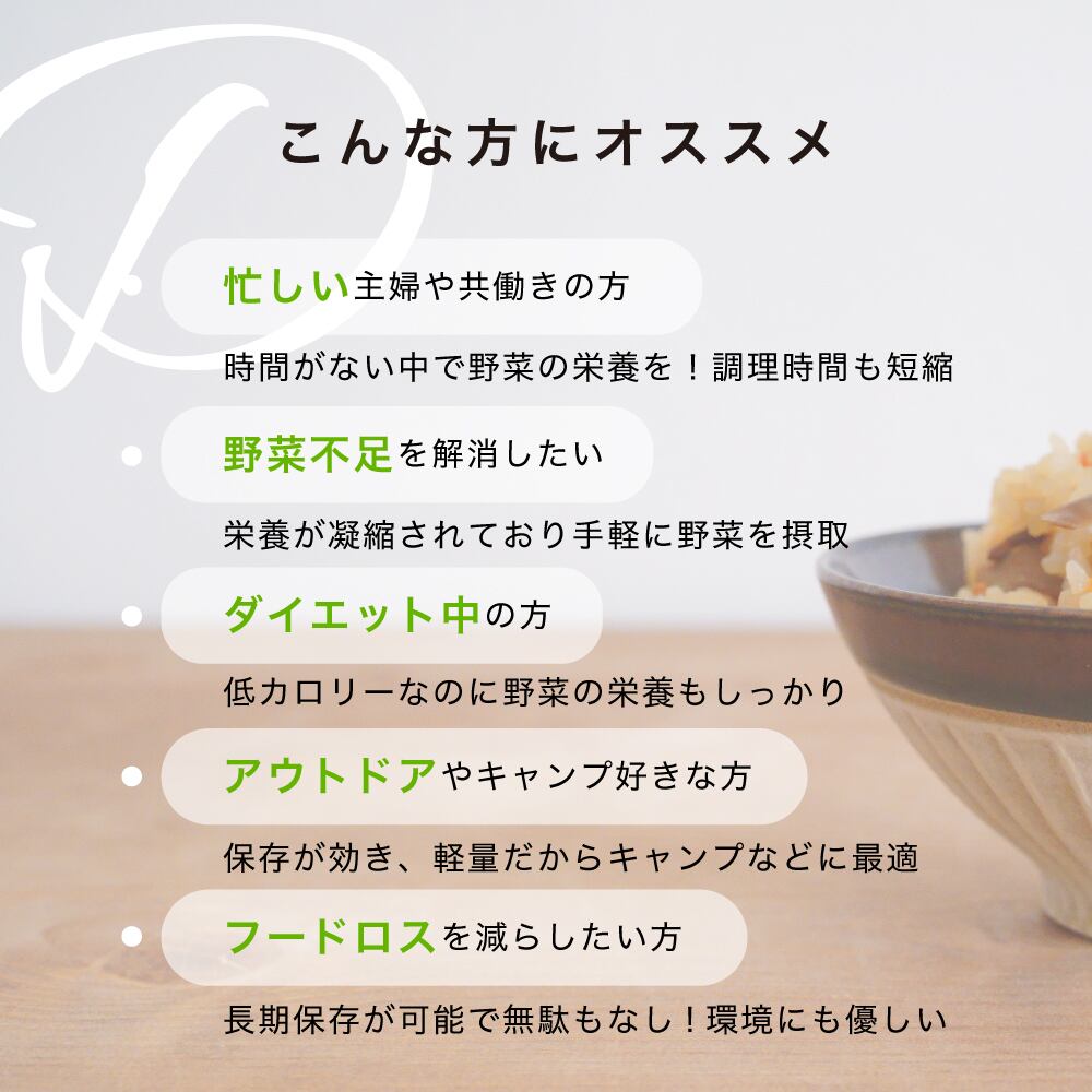 この乾燥野菜ミックスは、加熱するだけで、豊かな香りと旨味が引き立つ一品となります。毎日の食卓に、栄養価の高いお料理をプラスできる優れたアイテムです。ご飯に混ぜるだけでなく、スープやお料理の具材としても大活躍します。ぜひ、乾燥野菜ミックスをお試しください!